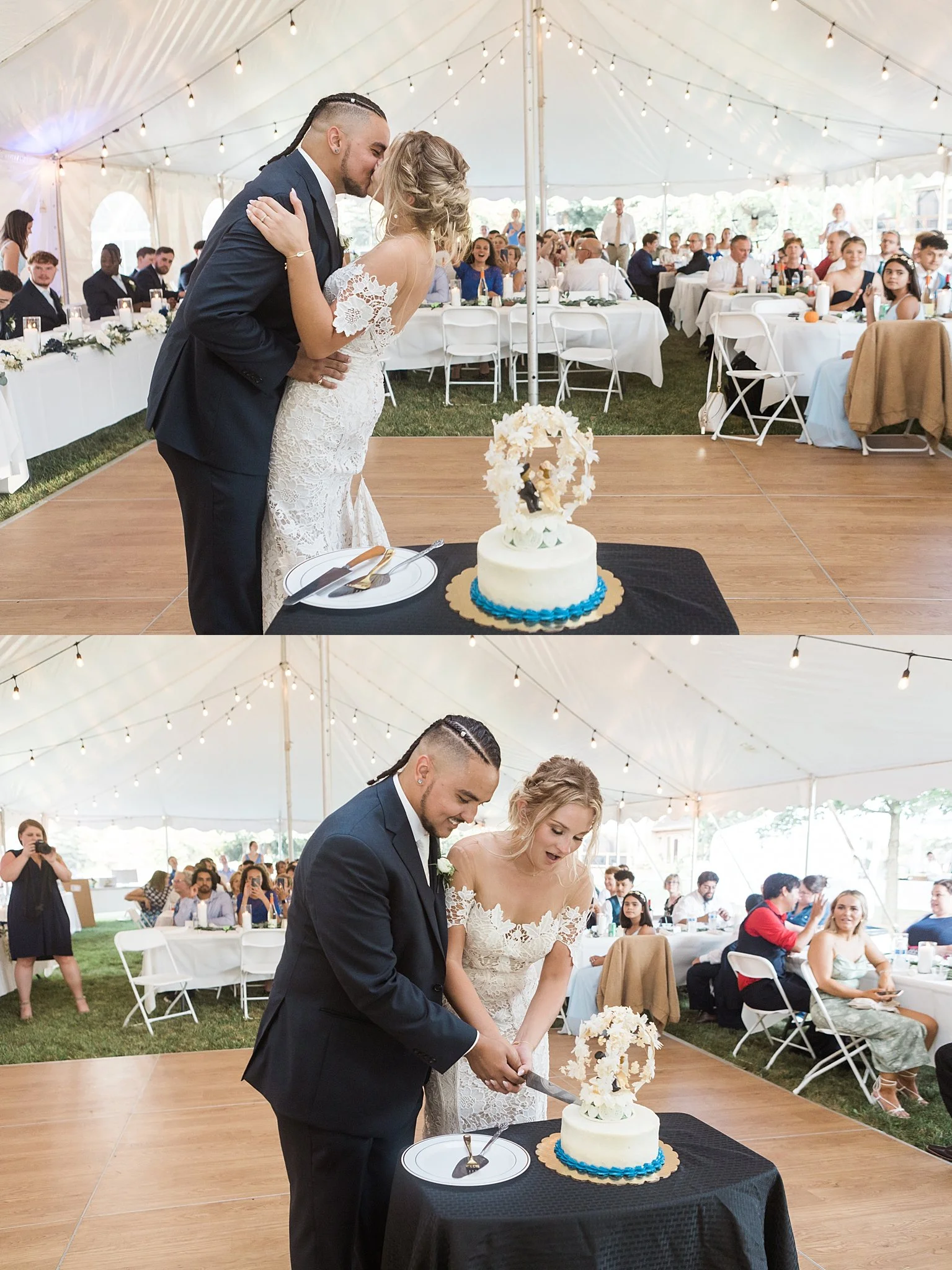 Venue: Bride’s Parent’s Home | Photographer: Ashley Susan Photography | Catering: Valli Produce Catering | Wedding Cake: Nalia Warmack | DJ: Music That Moves | Bridesmaids Dresses: Azazie | Groom + Groomsmen Attire: Men's Wearhouse | Hair & Makeup: Mary Borow | Stationery: Made By Mead